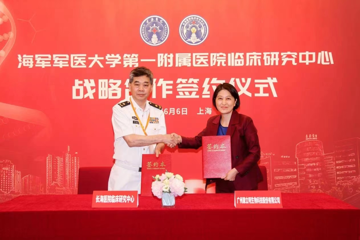 簽約儀式現場,左為長海醫院臨床研究中心主任李兆申院士,右為康立明生物首席市場官鄧曉琴。