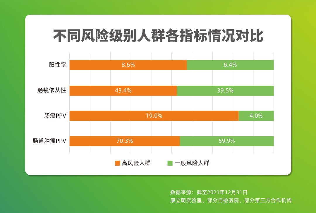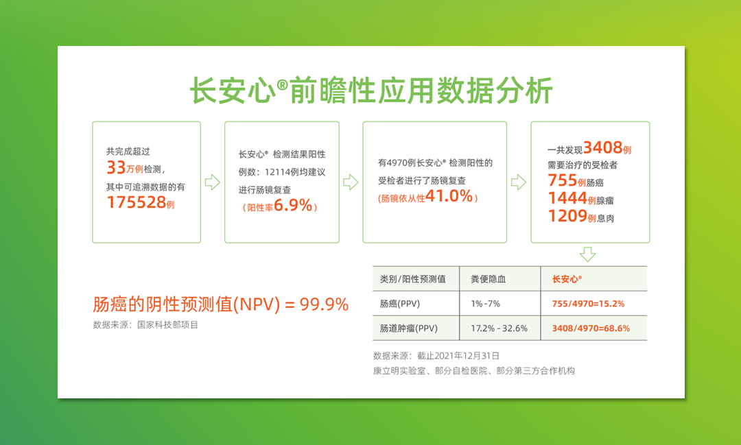截至2021年12月,作為持續披露真實世界應用數據的腸癌糞便基因檢測產品,長安心®共完成33萬例前瞻性應用檢測,其中175528例應用數據可追溯,12114例受檢者長安心®檢測結果陽性(陽性率6.9%),其中4970例長安心®檢測結果陽性的受檢者進行了腸鏡復查(腸鏡依從性41.0%),一共發現3408例需要治療的受檢者,其中755例腸癌,1444例腺瘤,1209例息肉。長安心®對腸道腫瘤的預測值(PPV)為68.6%(其中腸癌的陽性預測值為15.2%),來自國家科技部項目的數據顯示,長安心®的陰性預測值更是高達99.9%。
