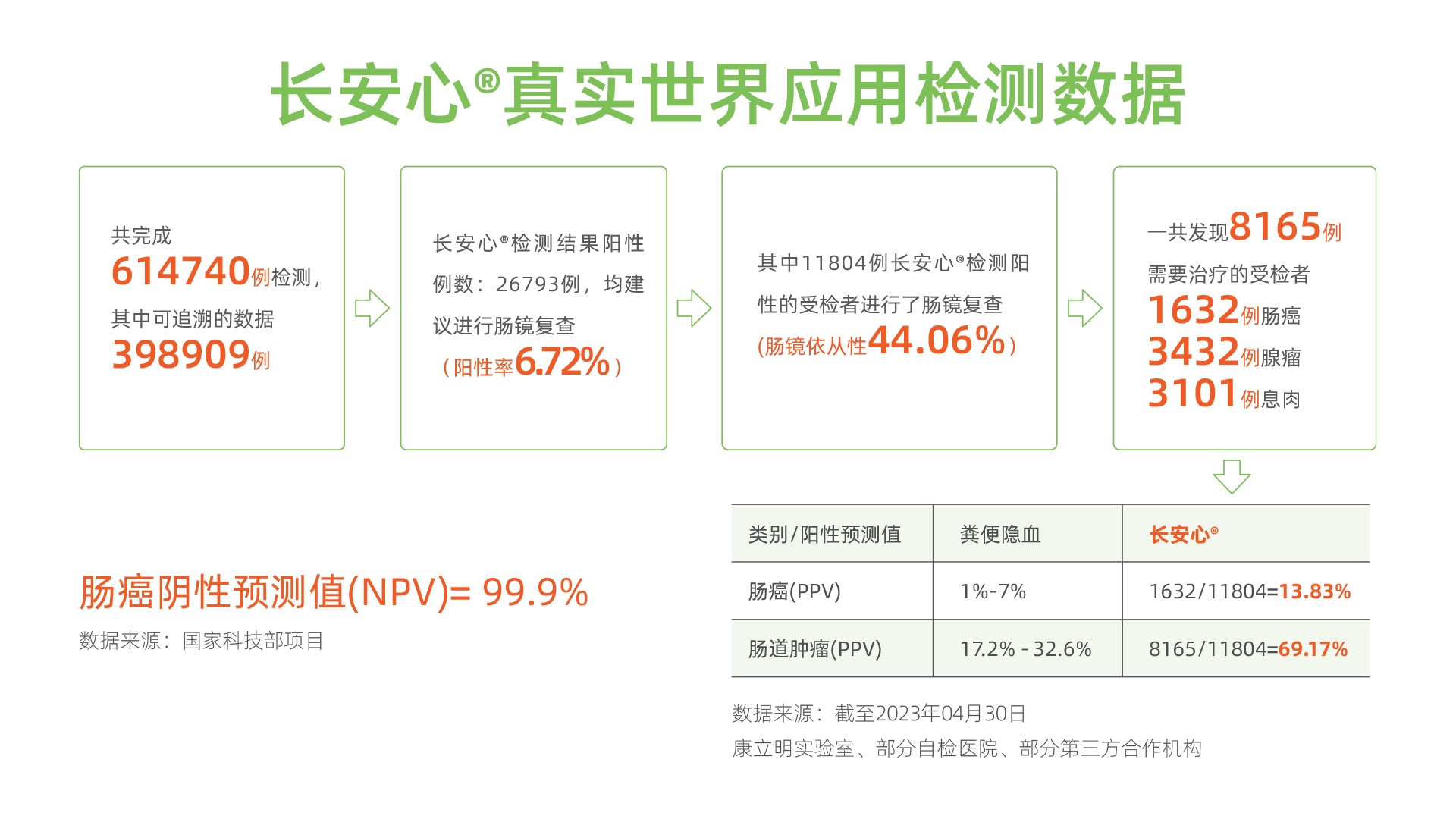 活動現場,康立明生物發布最新的真實世界應用檢測數據。來自康立明醫學檢驗實驗室、部分自檢醫院、部分第三方合作機構的數據顯示:截至2023年4月30日,長安心®共完成614740例檢測,其中可追溯數據398909例。長安心®檢測結果陽性數26793例(陽性率6.72%),均建議進行腸鏡復查,其中11804例長安心®檢測陽性受檢者進行了腸鏡復查(腸鏡依從性44.06%),一共發現8165例需要治療的受檢者,其中腸癌1632例、腺瘤3432例、息肉3101例,腸癌陽性預測值(PPV)13.83%,腸道腫瘤陽性預測值(PPV)69.17%,腸癌陰性預測值(NPV)99.9%,為千萬家庭的腸道健康保駕護航。